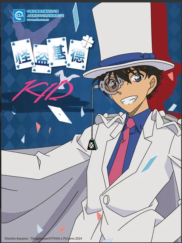白色斗篷、高礼帽,单片夹鼻眼镜。出现在午夜的高楼,留下拿走宝石的通知函。这是我们熟知的怪盗基德。在《名侦探柯南》里,他是不亚于工藤新一和江户川柯南的明星人物。而他的真实身份则是高中生黑羽快斗(山口胜平 配音),为了调查父亲的失踪事件,扮起了父亲之前扮演的角色——怪盗基德,希望引出神秘组织的出现,进而调查出事情的真相。