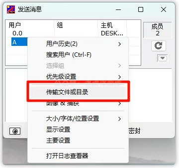 右键点击目标用户,可以选择传输文件或目录,添加相应文件后即可发送!